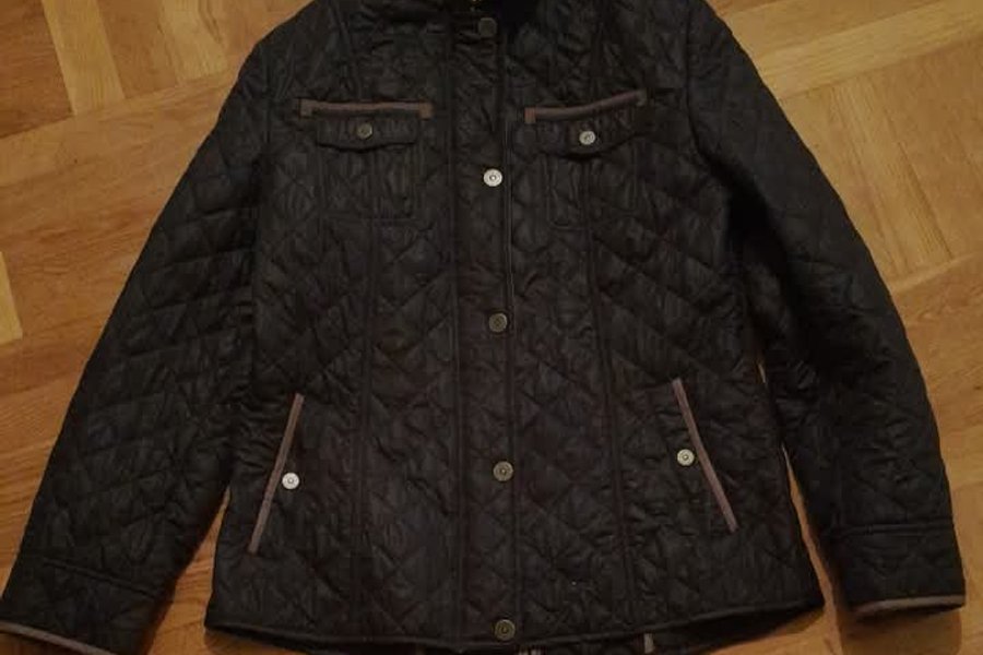 Svart quiltad jacka med knäppning fram. Jackan har en krage och två fickor med knappar på bröstet samt två fickor nedtill.