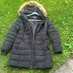 Svart jacka med huva och detaljer i päls. Ser mycket bättre ut i verkligheten. Äkta päls.