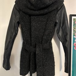 Svart jacka med hög krage och huva. Jackan har ett quiltat mönster.jacka har Amica märke och är i storlek 38,