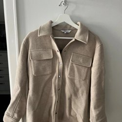 Beige jacka med krage och knappar framtill. Jackan har två fickor fram.