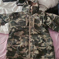Mörkblå jacka med dragkedja och knappar. Jackan har en huva med fuskpäls.