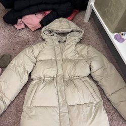 Lång, beige vinterkappa med huva inne cremevit färg. Jackan har en dragkedja framtill och fickor på sidorna.
