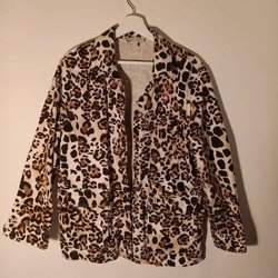 Leopardmönstrad jacka med krage och knäppning framtill. Jackan har ett rött foder. Storlek står inte i den, passar nog till S/M.