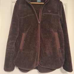 Vinröd jacka med dragkedja och knappar framtill. Jackan har en huva med dragsko och fyra fickor fram.