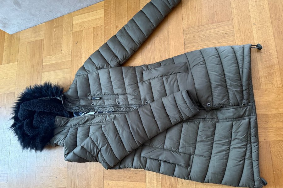 Khakifärgad jacka med huva och svart fuskpäls. Jackan har dragkedja och tryckknappar framtill.
