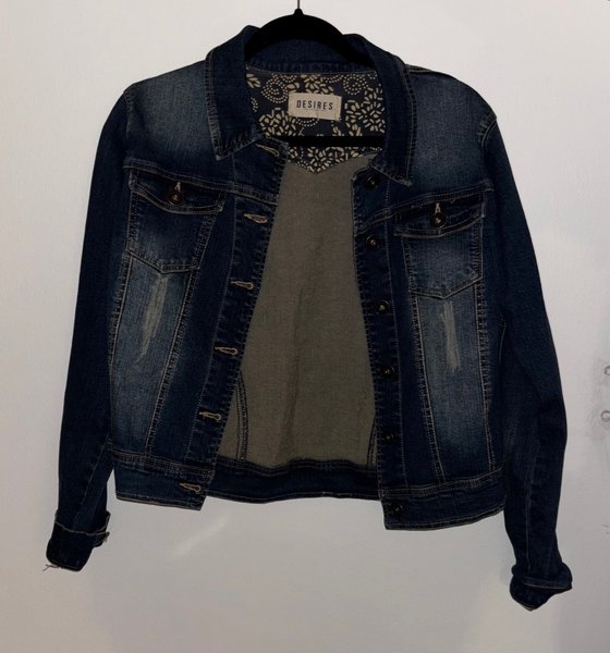 Mörkblå jeansjacka med knappar och fickor. Jackan har en ljusare insida med mönster. Storlek 36/38