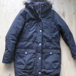 Varmfodrad damjacka från Etirel med justerbar kapuschong, dragkedja och knäppning, blå, storlek 42.