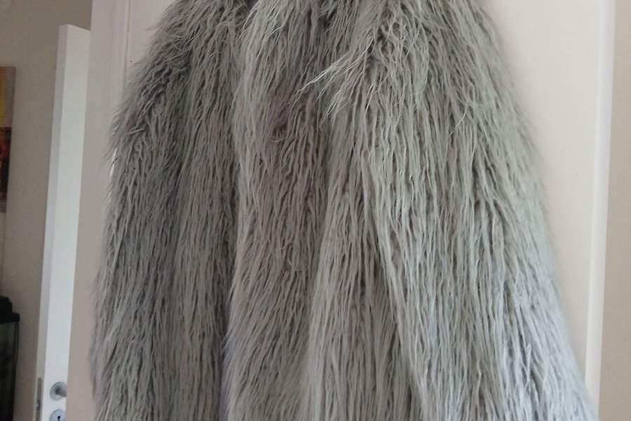 Grå, fluffig jacka som hänger på en dörr. Jackan har långa, mjuka fibrer som ger den ett unikt utseende.