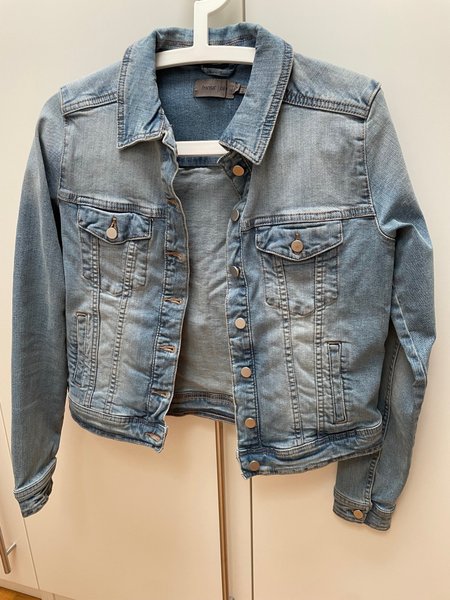 En figursydd denimjacka med knappar framtill och fickor, stl 36. Mjuk och stretchig, använd två gånger.