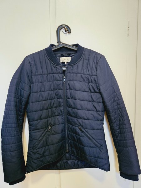 Marinblå jacka med dragkedja fram och två fickor med dragkedja. Passar till vår och höst.