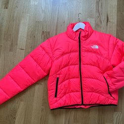 Färgstark jacka i rosa med tryck av skidåkare fram och bak. Jackan har en lila krage och ett limegrönt foder.
