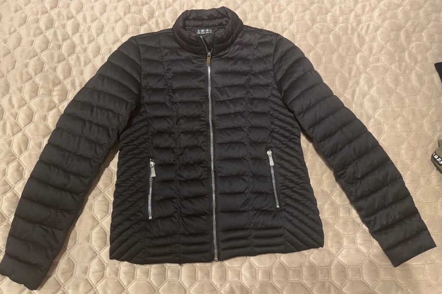 Svart jacka med dragkedja och fickor med dragkedja fram. Jackan är använd 2-3 ggr . Stl 34