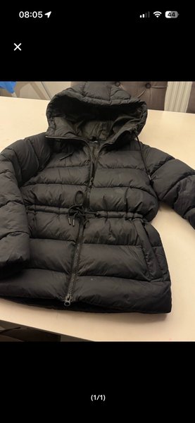 Svart pufferjacka med dragkedja och huva. Jackan har en dragsko i midjan för justerbar passform.