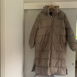 Beige pufferjacka med huva och dragkedja framtill. Jackan har en bekväm passform och är perfekt för kyligare dagar.