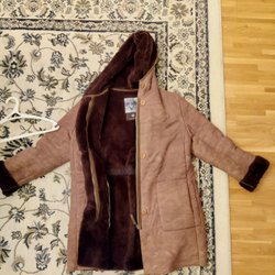 Lång pufferjacka med en huva som är prydd med fuskpäls. Jackan har både dragkedja och tryckknappar framtill för stängning. Den är utrustad med praktiska fickor och har dragkedjor på sidorna nertill.