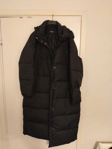 Lång svart dunjacka från ONLY med huva och dragkedja framtill. Jackan har en vadderad design.