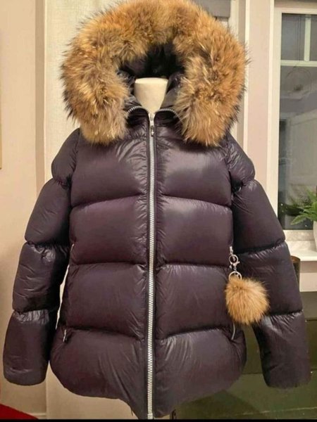Snygg, mörklila dunjacka med stor pälskrage och dragkedja fram. Jackan har en dekorativ pälsboll på sidan.