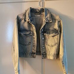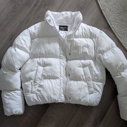 Mörkblå dunjacka med huva. Jackan har dragkedja fram och dragsko nedtill. Två fickor fram.