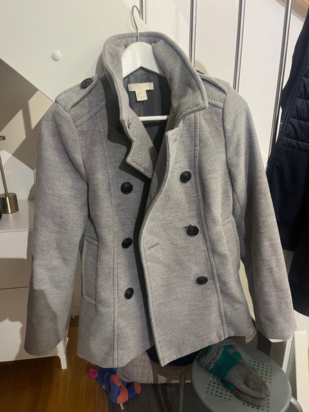 Grå, dubbelknäppt jacka med krage och axelklaffar. Jackan har svarta knappar. Mkt fint skick stl: 36 hm