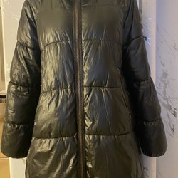 Lång pufferjacka med huva och dragkedja framtill. Jackan har dragsko i midjan och fickor i sidorna.