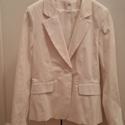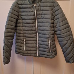 Ljusgrå/beige jacka med trekvartsärm och dragkedja fram. Jackan har en rund halsringning och en något utställd silhuett. I nyskick. Rök- och djurfritt hem