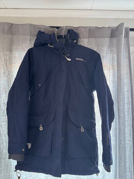 Didriksons 1913 jacka med huva och flera fickor. Jackan är mörkblå. Finns hund och häst i hemmet.