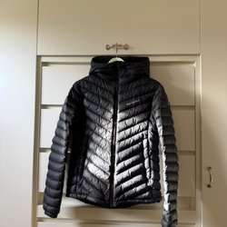 Svart jacka från Peak Performance Thermolite med dragkedja framtill och hög krage. Jackan har en stilren design med logotypen på bröstet och ett mönstrat foder.