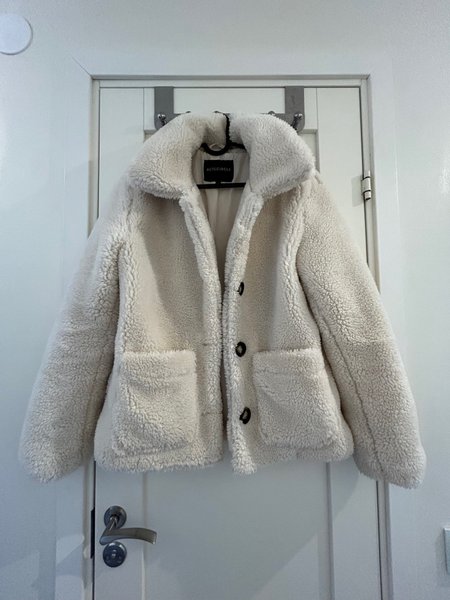 Vit, fluffig jacka med krage och knappar. Jackan har två fickor fram.
