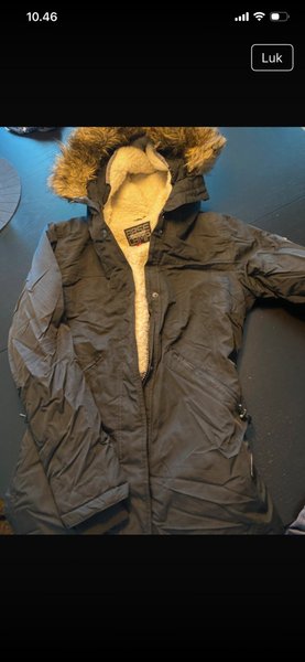 Vinterjakke med hætte og imiteret pelskant. Jakken har en lynlås og knaplukning foran. Den har en blød, lys foring indeni og flere lommer, herunder to brystlommer og to sidelommer med lynlås. Ærmerne har justerbare manchetter.