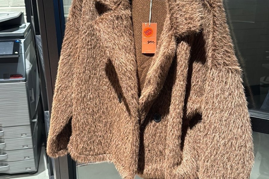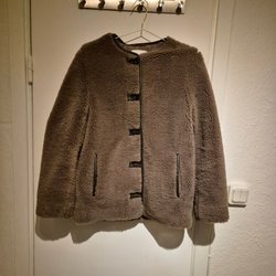 En brun jacka med en lurvig textur och en klassisk krage. Jackan har två knappar framtill för stängning och långa ärmar. Den har en avslappnad passform och är lämplig för olika tillfällen.