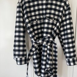 Svart jacka med huva och dragkedja. Jackan har fickor med dragkedja och knappar framtill. Den har ett quiltat mönster.