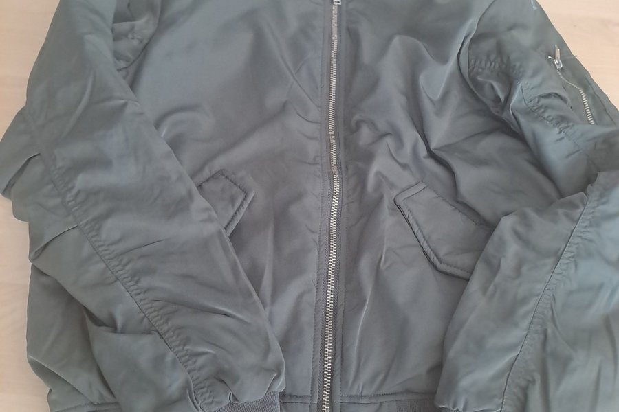 Grön bomberjacka med dragkedja framtill. Jackan har två fickor med lock fram och en mindre ficka med dragkedja på vänster ärm. Muddar finns vid ärmslut och nederkant.