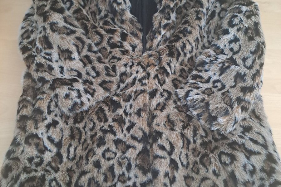 Leopardmönstrad fuskpälsjacka med krage och långa ärmar. Jackan har en rak passform och stängs med hakar framtill. Den har en mjuk och fluffig textur som ger en lyxig känsla. Perfekt för att lägga till en trendig touch till vilken outfit som helst.