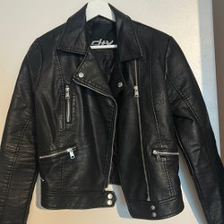 Svart skinnjacka med avtagbar huva och dragkedja. Jackan har detaljer vid ärmslut och fickor.