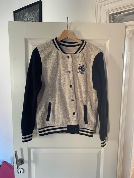 En jacka i bombermodell med tryckknappar framtill. Jackan har ribbade muddar i ärmslut och nederkant med ränder. På bröstet finns ett märke med texten "BROOKLYN NYC EST.86". Jackan har två fickor framtill.