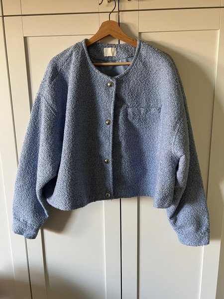 En kortare jacka från HM i en fin ljusblå färg med en texturerad yta. Jackan har en rund halsringning och knäpps med silverfärgade knappar framtill. Det finns en liten bröstficka på ena sidan. Ärmarna är långa och har en avslappnad passform. Storlek XXL.