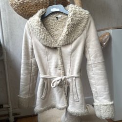 ??Sort vatteret jakke med hætte og imiteret pels. Jakken har en flettet bælte i taljen og lynlåslommer og sidder virkelig flot på kroppen.