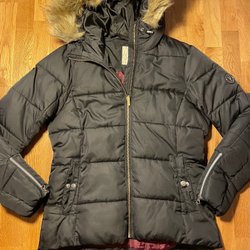 Svart vinter jacka med dragkedja fram och en huva med avtagbar fuskpäls. Smal i modellen Jackan har ribbstickade detaljer på sidorna och fickor i sidorna samt en innerficka. Mycket fint begagnat skick.