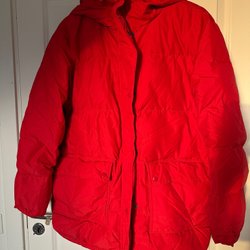Svart Guess dunjacka med avtagbar huva och fuskpäls. Jackan har en dragkedja framtill och ett bälte i midjan med ett guldfärgat spänne. Två fickor fram med tryckknappar.