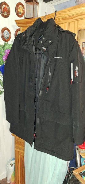Svart vinterjacka med flera fickor och dragkedjor. Jackan har logotyperna "Aqua SD" och "ONEPEAK" på framsidan, samt "Aquatex" på ärmen.