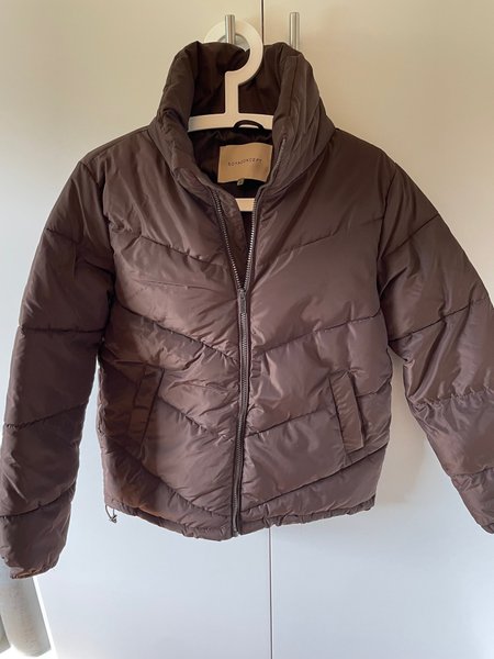Brun pufferjacka med hög krage och dragkedja fram. Stl XS, använd en gång.