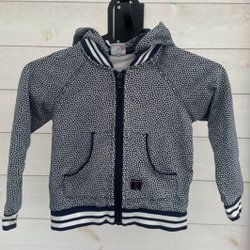 Gråmelerad jacka med dragkedja fram samt byxa . Jackan har en vit rand längs sidan och en liten logga på bröstet.