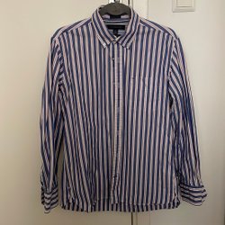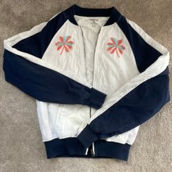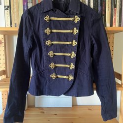 Marinblå jacka med quiltat mönster och tryckknappar. Jackan har en hög krage och dragkedja fram. Saknas nedersta knappen (se sista bilden). Använd ett fåtal gånger