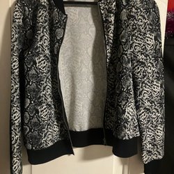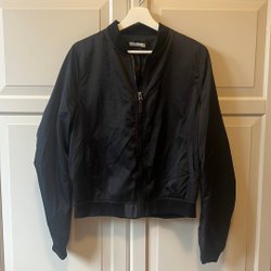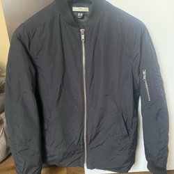 Svart bomberjacka med dragkedja framtill och ett diskret mönster. Jackan har muddar vid ärmslut och nederkant.