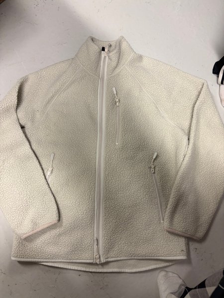 Ljus beige fleecejacka med hög krage och dragkedja fram. Jackan har två fickor med dragkedja på sidorna och en bröstficka med dragkedja.