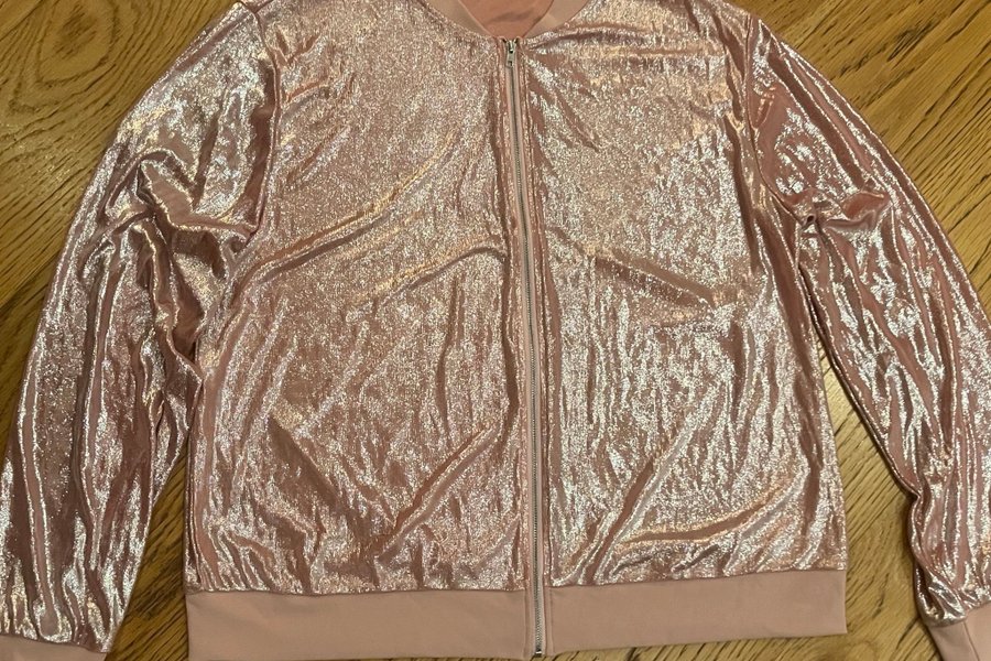 Glittrig bomberjacka i ljusrosa med dragkedja framtill. Perfekt för festen, ”pink party” eller discot! Storlek XL. Aldrig använd