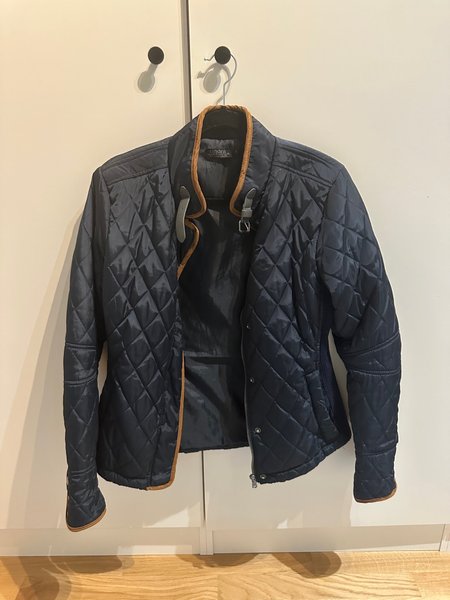Marinblå jacka med quiltat mönster och detaljer i en kontrasterande färg. Jackan har en krage och stängs med dragkedja och spännen.