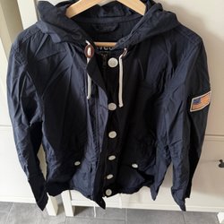 Marinblå jacka med huva och dragsko. Jackan har knappar framtill och två fickor med knapp.