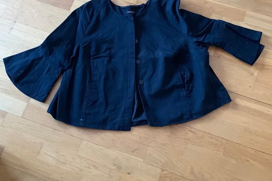 Svart jacka med trekvartsärmar och knappar framtill. Jackan har en rundad halsringning och en lätt utsvängd passform.