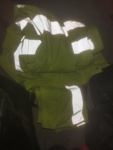 En gulgrön jacka med reflexdetaljer. Jackan har långa ärmar och en krage. Reflexerna är placerade på ärmarna och överkroppen.